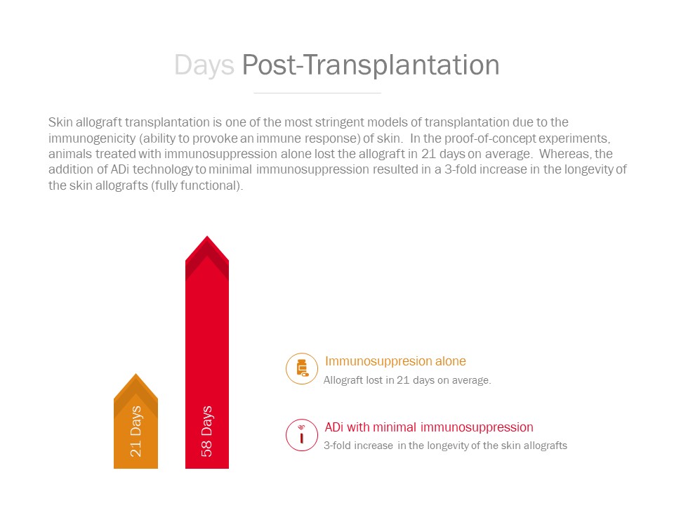 While immune suppression requires continuous administration to prevent acute or early rejection of transplanted organs, induction of tolerance has the potential to retrain the immune system to accept the organ for longer periods of time. Thus, ADi may allow patients to live with transplanted organs with significantly reduced dependence on immune suppression.